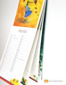 Un calendario bello come pochi, lungo e sottile trova sempre posto sul muro di casa. Si sviluppa in verticale, con il disegno in alto e i giorni del mese, su due colonne, in basso. In questo calendario da muro trovano posto tutte le cose importanti: impegni, appuntamenti, compleanni e anche sogni, pensieri e desideri. Le giornate di festa sono evidenziate e, immancabilmente, sono segnate le fasi lunari.