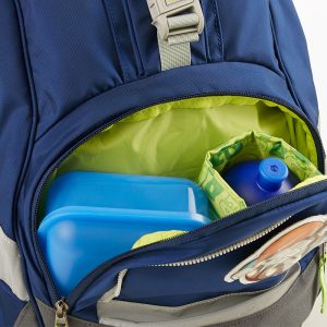 Spaziosa tasca frontale per borraccia e contenitore per la merenda.