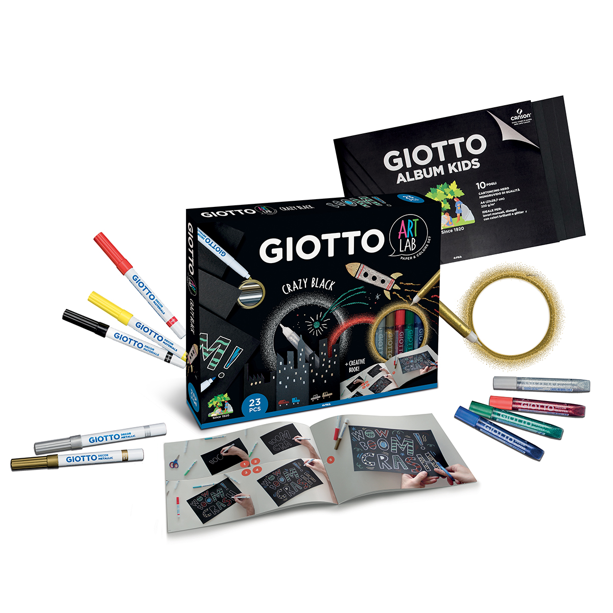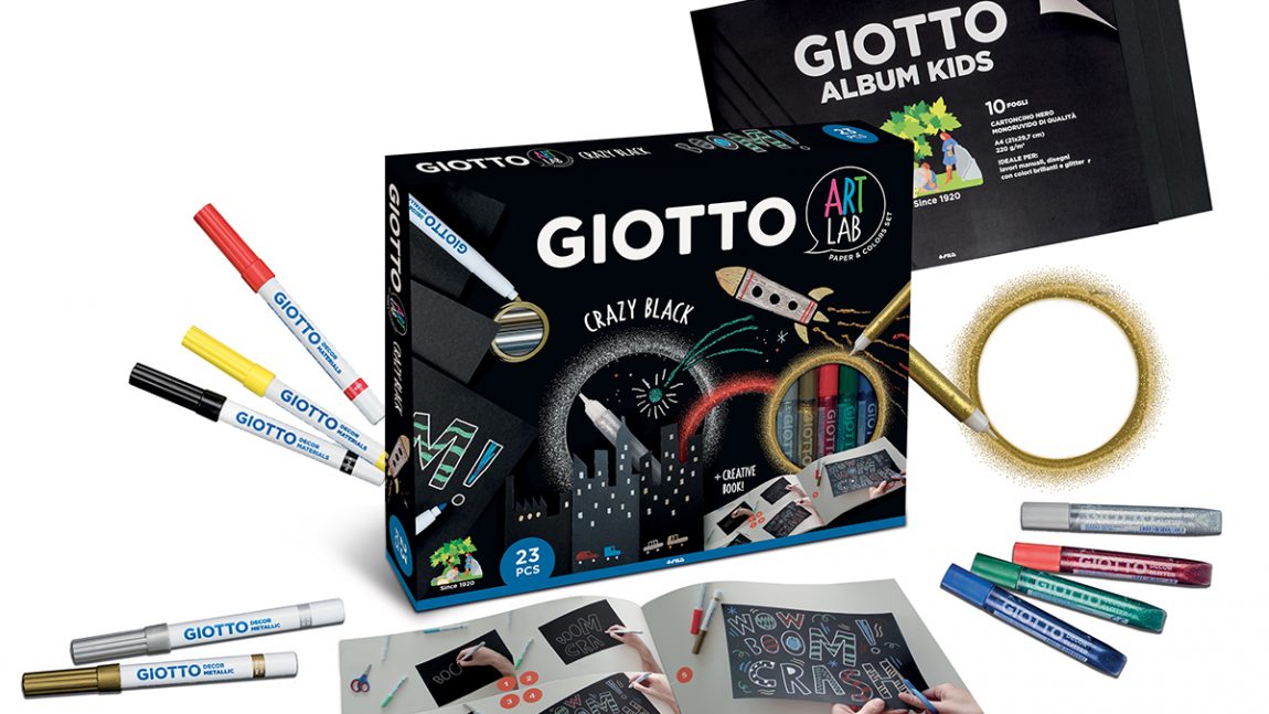 Con questo set creativo della linea GIOTTO ART LAB Paper&Colors si gioca con il lettering e le onomatopee, la città e lo spazio. Il set contiene: l’Album Kids Giotto con cartoncini neri, i pennarelli Decor Metallic Oro e Argento, i pennarelli Decor Materials, le colle Decor Glitter e il creative book per farsi ispirare.