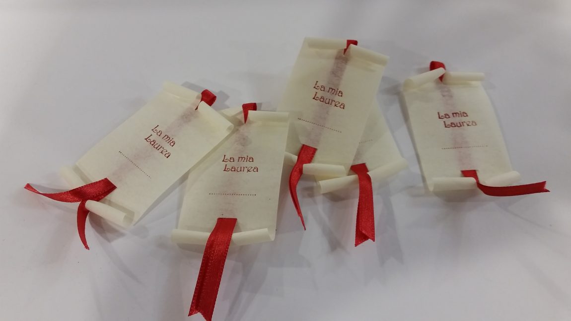 A forma di mini pergamena da arrotolare, con nastrino rosso.