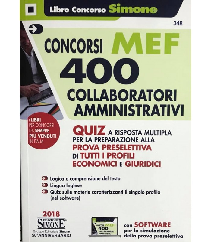 Sulle G.U. n. 25 del 27-3-2018 e n. 28 del 6-4-2018 sono stati pubblicati i bandi dei 6 concorsi indetti dal Ministero dell’Economia e delle Finanze (MEF) per l’assunzione a tempo indeterminato di complessivi 400 collaboratori amministrativi per vari profili, con i seguenti orientamenti: statistico ed economico-quantitativo (80 unità), economico-aziendale e contabile (90 unità), economico-finanziario (60 unità), giuridico-finanziario (50 unità), giuridico-tributario (40 unità), giuridico nell’ambito dei servizi amministrativi trasversali (80 unità). Il volume costituisce un indispensabile sussidio per prepararsi, in particolare, alla prova preselettiva, la quale consisterà, per tutti i profili, in un esame di 80 minuti (da effettuarsi anche con l’ausilio di sistemi computerizzati) finalizzato alla risoluzione di 90 quesiti a risposta multipla, di cui 20 di Logica e di comprensione del testo e 70 tesi a verificare la conoscenza della Lingua inglese e delle materie caratterizzanti il profilo per cui si concorre.