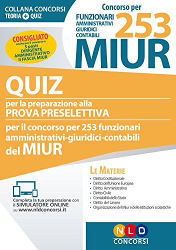 Il MIUR (Ministero dell’Istruzione, dell’Università e della Ricerca), in data 27 marzo 2018, ha indetto un concorso pubblico, per esami, a 253 posti per l’accesso al profilo professionale di funzionario amministrativo-giuridico-contabile, area III, posizione economica F1. Lo svolgimento del concorso prevede due prove scritte e un colloquio interdisciplinare. Qualora il numero delle domande di partecipazione alla procedura concorsuale sia elevato, si renderà necessario procedere a una prova preselettiva, consistente nella somministrazione di 100 quesiti, vertenti sulle discipline previste per le prove scritte, ovvero: diritto costituzionale, diritto dell’Unione Europea, diritto amministrativo, diritto civile con particolare riferimento a obbligazioni e contratti, contabilità di Stato, diritto del lavoro con particolare riferimento alla disciplina del lavoro alle dipendenze della P.A., organizzazione del Miur e delle istituzioni scolastiche. Il presente volume costituisce un valido strumento per la preparazione alla prova preselettiva del Concorso.
