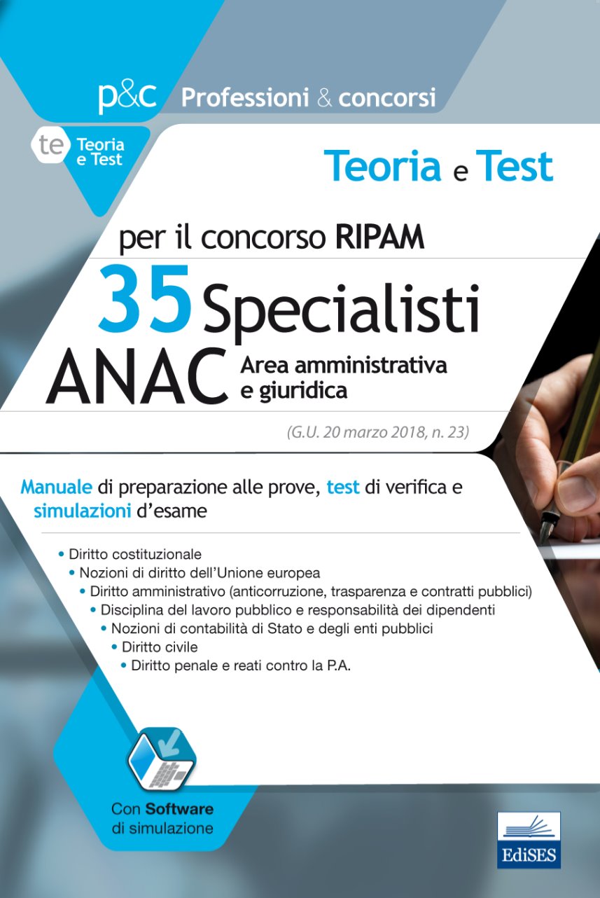 Il volume è rivolto a quanti devono sostenere le prove di selezione per il concorso RIPAM a 35 posti di Specialista area amministrativa e giuridica nell’ANAC (bando in G.U. 20-3-2018, n. 23). Il testo riporta una trattazione manualistica per affrontare in modo efficace la prova preselettiva, in particolare per quanto riguarda le discipline giuridiche, offrendo un’ampia e approfondita esposizione, con aggiornamenti ai vari provvedimenti pubblicati negli ultimi mesi. Online sono disponibili numerosi test di verifica che seguono fedelmente la trattazione manualistica. Grazie al software online accessibile gratuitamente è possibile effettuare infinite verifiche e simulare lo svolgimento della prova preselettiva. I questionari sono impostati in modo da allinearsi alle metodologie comunemente adottate nelle prove ufficiali dei concorsi pubblici relativamente al numero di domande, tempo a disposizione e attribuzione dei punteggi e includono domande di test di carattere logico-matematico e critico-verbale.