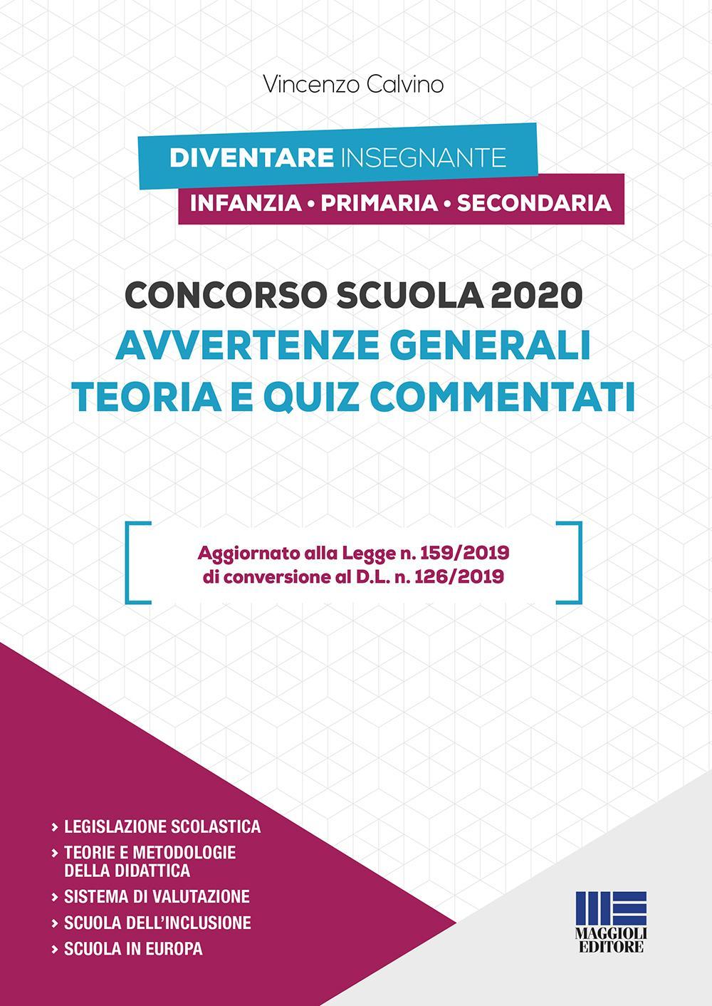 È aggiornato alla normativa scolastica di recente approvazione: Legge n. 159/2019 di conversione del D.L. n. 126/2019 (Misure di straordinaria necessità ed urgenza in materia di reclutamento del personale scolastico e degli enti di ricerca e di abilitazione dei docenti); decreti legislativi in attuazione della legge n. 107/2015; riforma degli istituti professionali del d.lgs. n. 61/2017; riforma sull’esame di Stato e sulla valutazione del d.lgs. n. 62/2017; decreti ministeriali n. 741 e n. 742 del 2017; integrazioni e modifiche all’alternanza scuola-lavoro, alla riforma del sostegno e al reclutamento docenti apportate dalla Legge di Bilancio 2019; raccomandazione del Consiglio UE del 22 maggio 2018 sulle competenze chiave per l’apprendimento permanente.