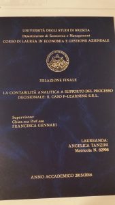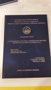 Tesi rilegata in similpelle blu con leggere venature, il più classico dei colori, il preferito dagli studenti. Ciò che rende questa tesi particolare è la scelta del colore della scritta: al posto dei soliti abbinamenti con argento o oro, abbiamo scelto il color PANNA.